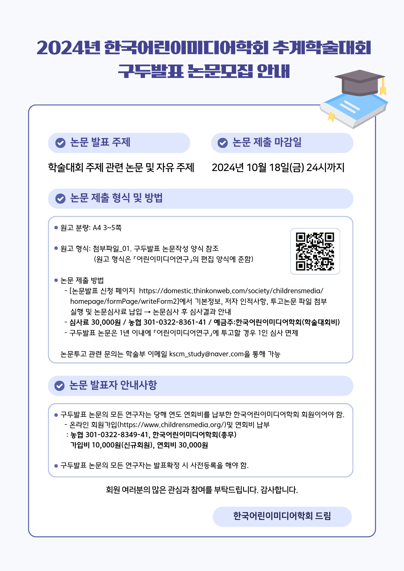 한국어린이미디어학회에 관심을 갖고 참여해주시는 회원님들께 깊이 감사드리며, 2024년 11월 16일(토)에 개최되는 추계학술대회 구두발표 논문모집을 안내해 드립니다.