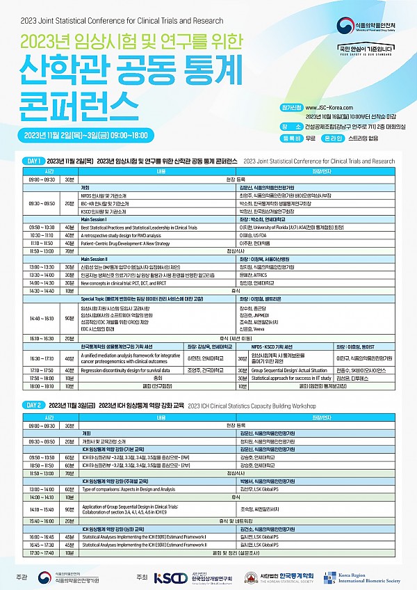 식품의약품안전평가원에서 주관하고, 한국임상개발연구회, 한국통계학회, Korea Region International Biometric Society에서 주최하는 2023 산학관 공동 통계 콘퍼런스가 11월 2~3일, 이틀간 개최됨을 알려드립니다.
