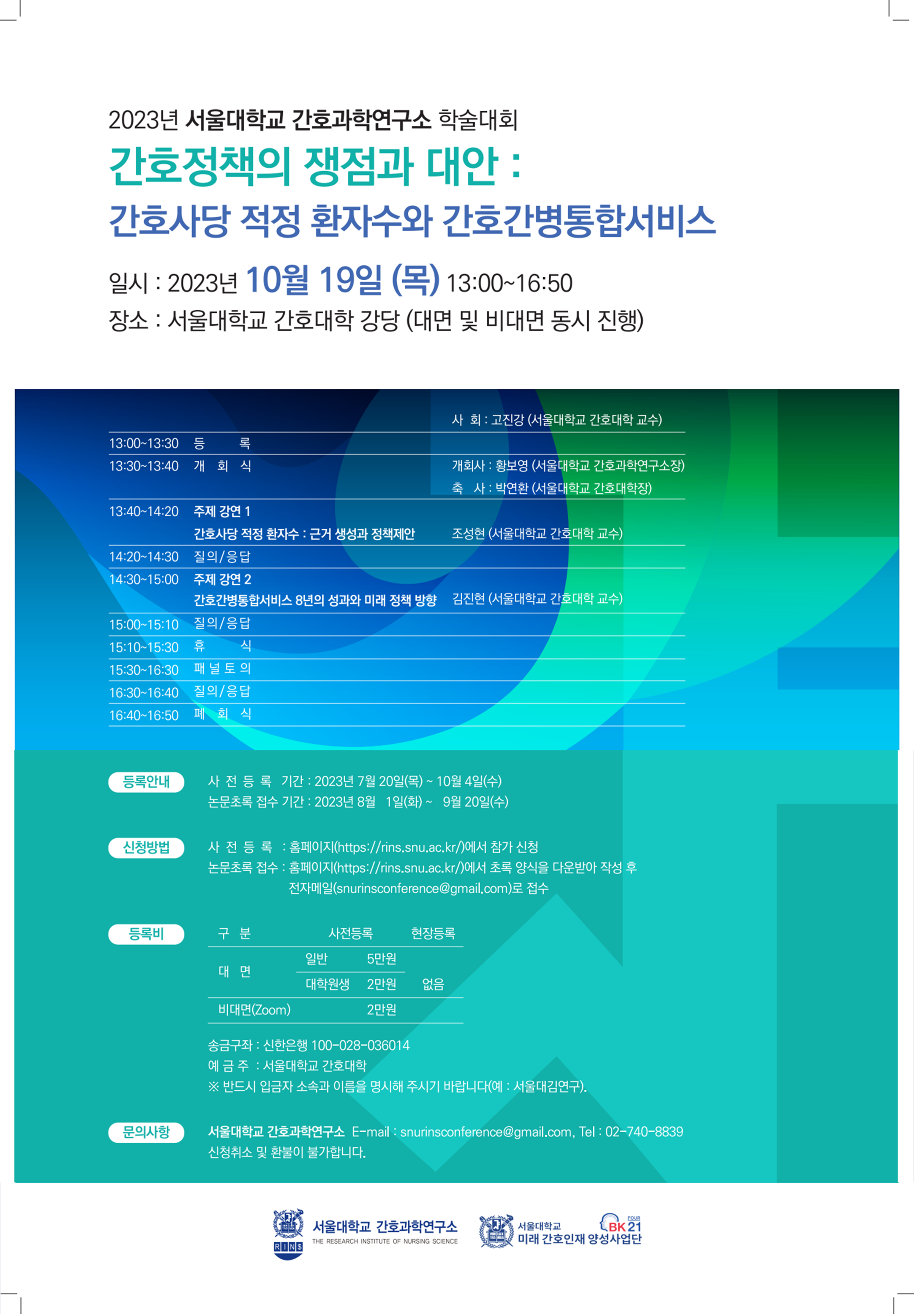 서울대학교 간호과학연구소 & BK21에서 주관하는 2023년 국내학술대회가 아래와 같이 진행될 예정입니다.