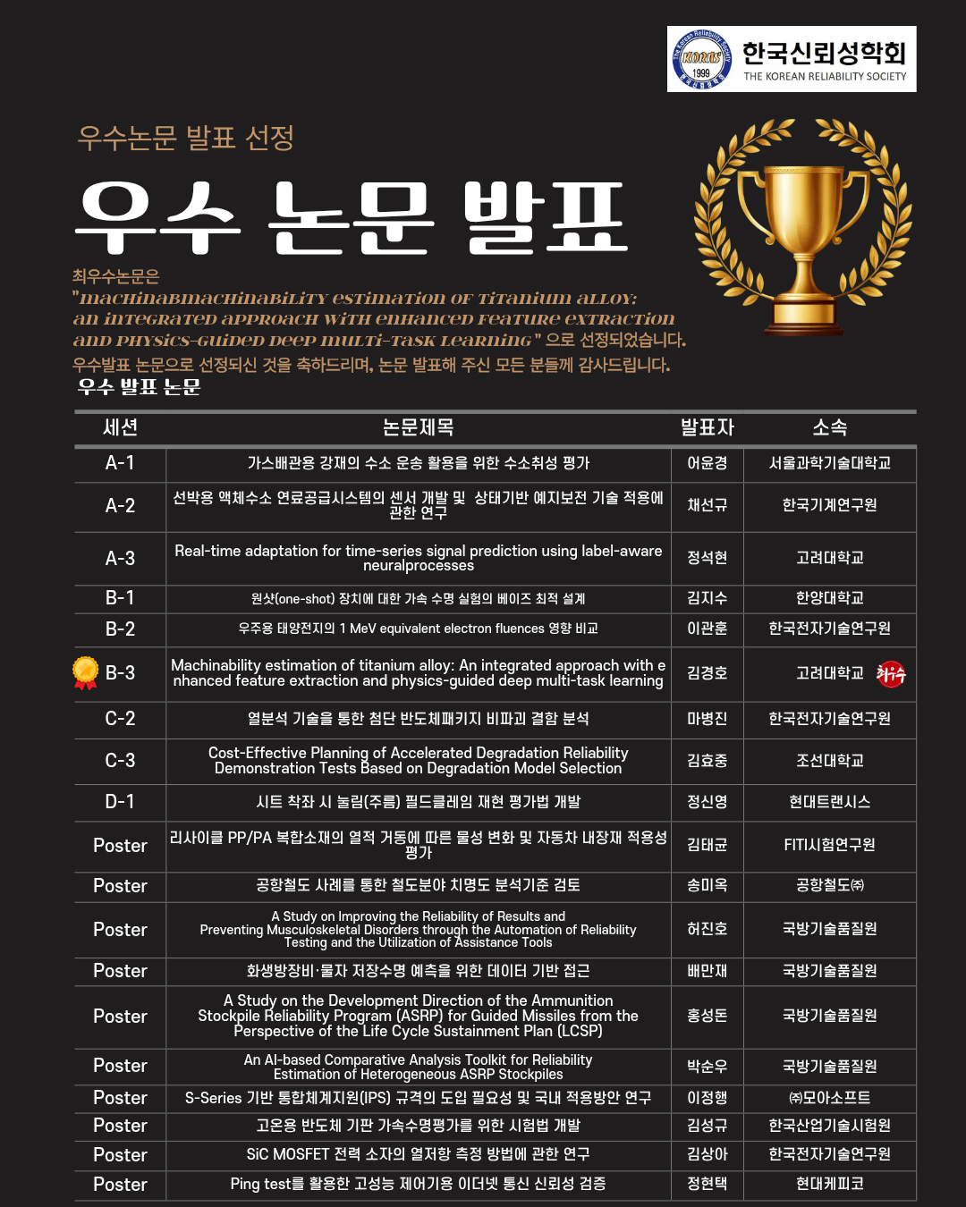 한국신뢰성학회 2025 추계학술대회 우수 발표 논문 선정 안내