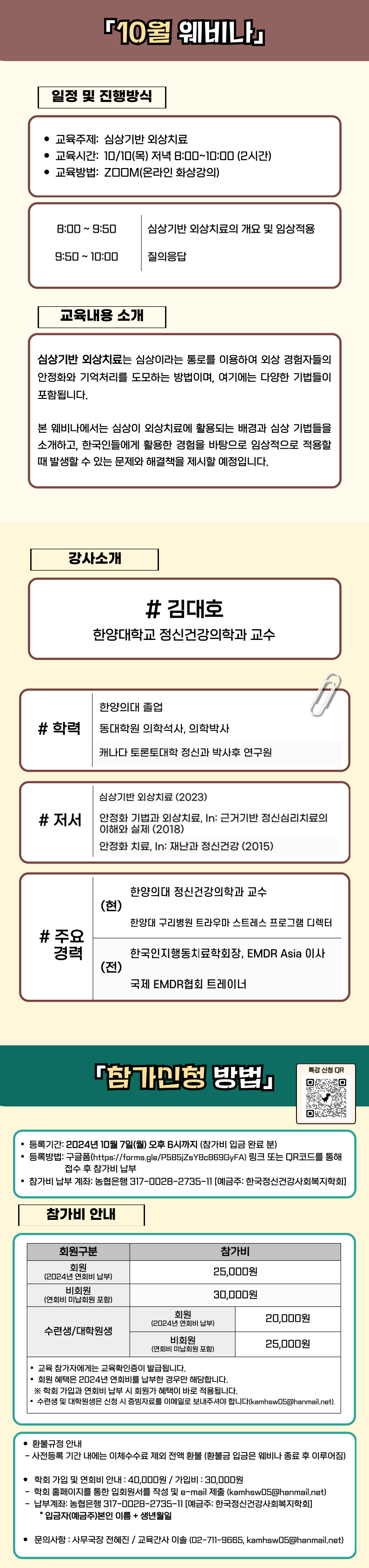 한국정신건강사회복지학회 학대/재난/트라우마분과에서는 '트라우마 심리치료 기억처리단계에서의 근거기반 치료 개입의 실제 - 심상기반 외상치료'를 주제로 10월 웨비나를 개최하고자 합니다.