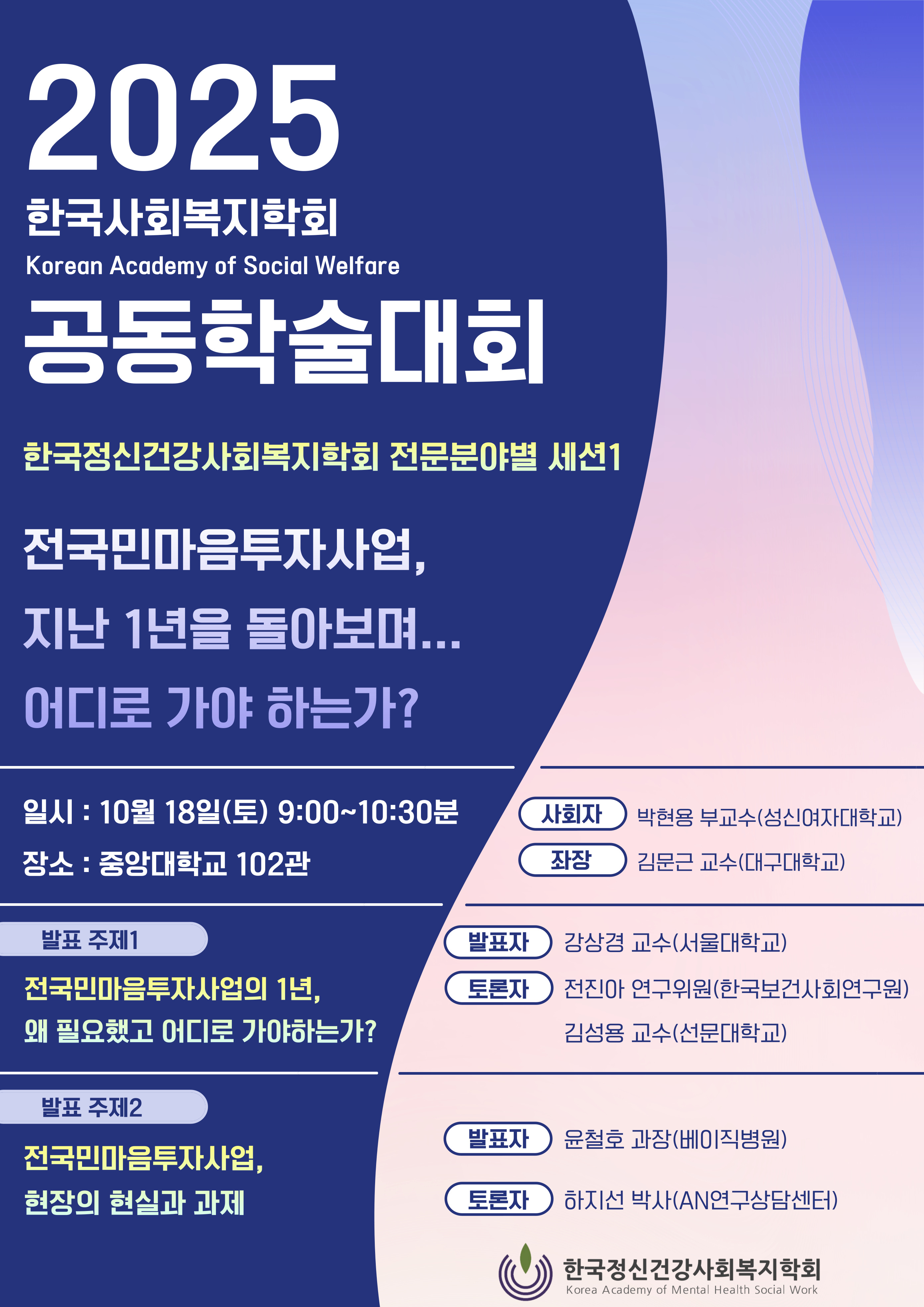 한국사회복지학회 공동학술대회가 2025년 10월 17일(금) ~18일(토)에 중앙대학교에서 진행됩니다.