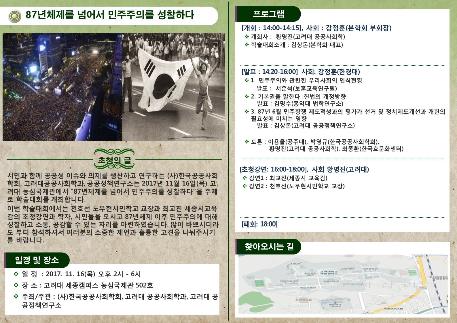 사단법인 한국공공사회학회와 고려대 공공사회학과, 고려대 공공정책연구소는 2017년 11월 16일(목) 고려대 세종캠퍼스에서 “87년체제를 넘어서 민주주의를 성찰하다” 주제로 추계학술대회를 개최합니다. 바쁘시더라도 부디 참석하셔서 여러분의 소중한 경험과 지식을 함께 나눠주시기를 부탁드립니다.