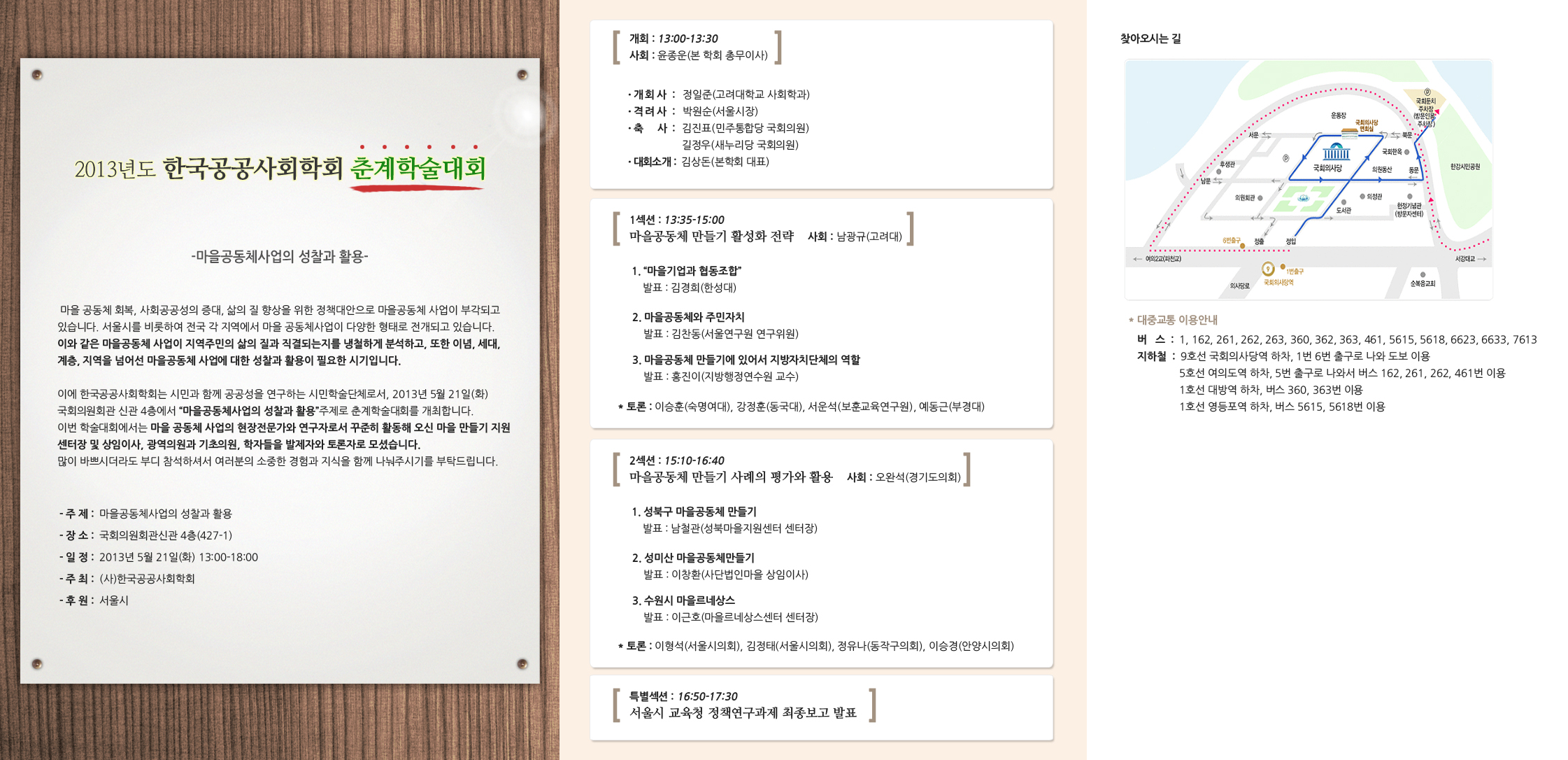이에 한국공공사회학회는 시민과 함께 공공성을 연구하는 시민학술단체로서, 2013년 5월 21일(화) 국회의원회관 신관 4층에서 “마을공동체사업의 성찰과 활용”주제로 춘계학술대회를 개최합니다. 이번 학술대회에서는 마을 공동체 사업의 현장전문가와 연구자로서 꾸준히 활동해 오신 마을 만들기 지원 센터장 및 상임이사, 광역의원과 기초의원, 학자들을 발제자와 토론자로 모셨습니다. 많이 바쁘시더라도 부디 참석하셔서 여러분의 소중한 경험과 지식을 함께 나눠주시기를 부탁드립니다.