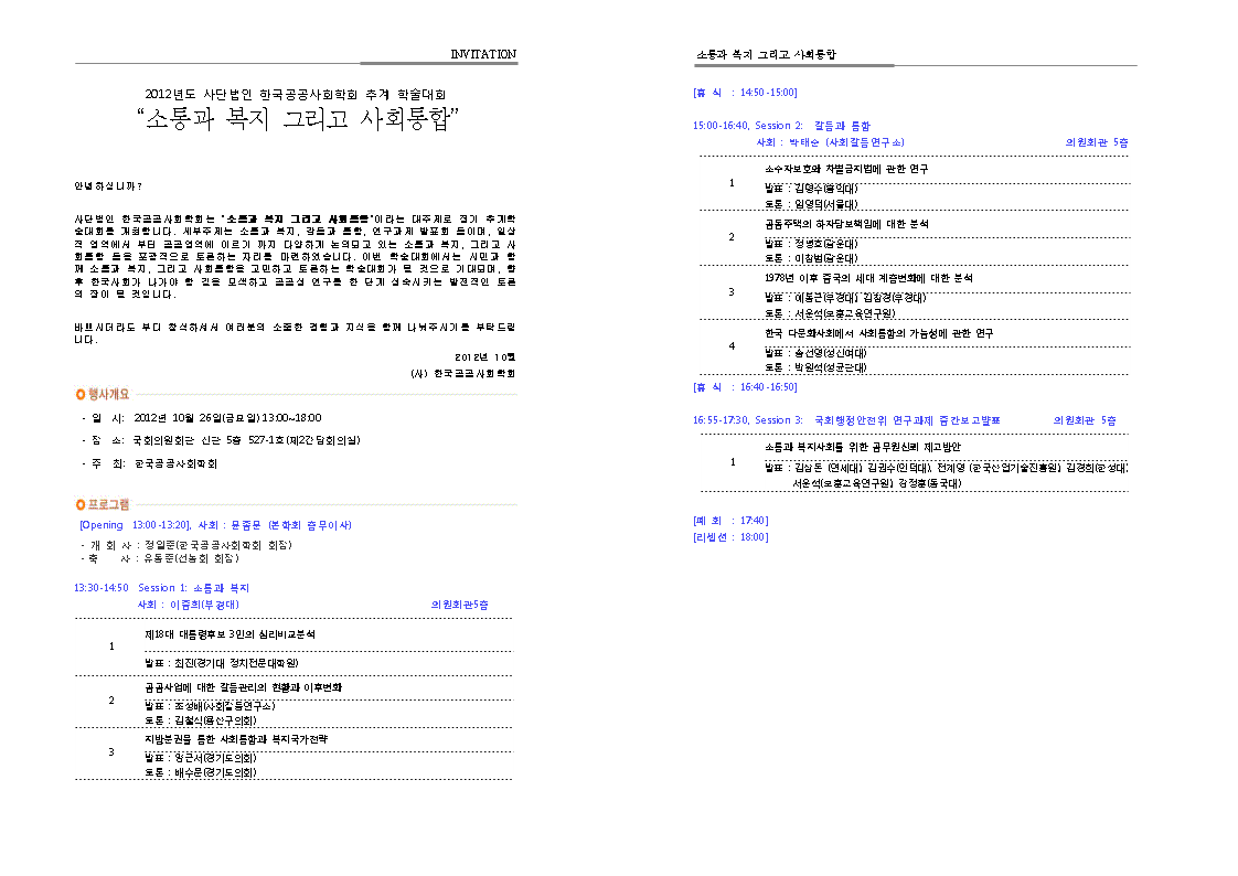 사단법인 한국공공사회학회는 시민과 함께 공공성을 연구하는 시민학술단체로서, 2012년 8월 17일(금) 국회 의원회관 신관 5층 간담회의실에서 “소통과 복지 그리고 사회통합 ” 주제로 추계 학술대회를 개최합니다. 바쁘시더라도 부디 참석하셔서 여러분의 소중한경험과 지식을 함께 나눠주시기를 부탁드립니다.