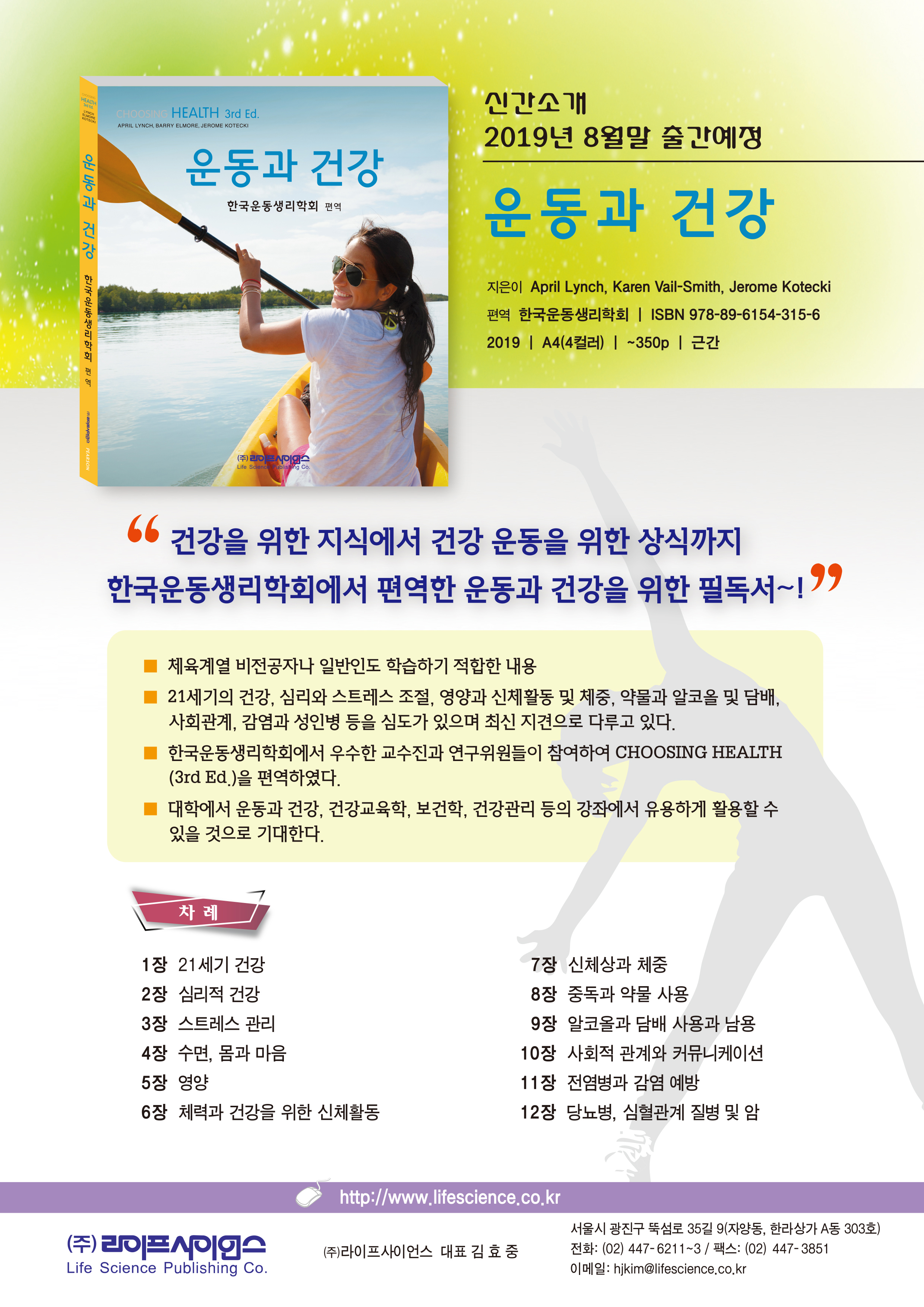 한국운동생리학회에서 편역한 운동과 건강을 위한 필독서 “운동과 건강” 3판이 8월 말에 라이프사이언스에서 출간 예정이어서 안내를 해드립니다.