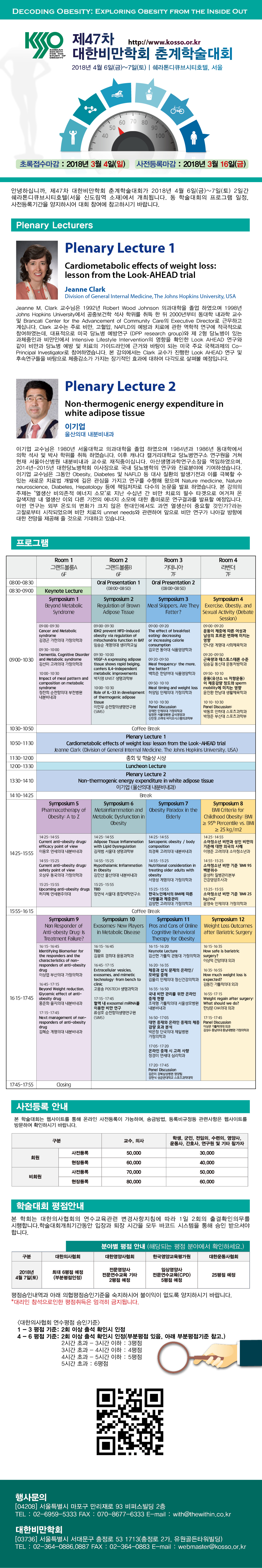 미국 존스홉킨스 대학의 Jeanne Clark 교수님과 울산의대 이기업 교수님을 모시고 2개의 기조 강연을 준비하였습니다. Jeanne Clark 교수님은 체중 감량이 심혈관질환과 대사질환에 미치는 영향에 대해 강의해 주실 예정이고 이기업 교수님은 갈색 지방 조직에 대한 강의를 해주실 예정입니다. 그 외에도 식사 요법에 있어서 논란이 되는 여러가지 문제들, 행동치료에 있어서의 온라인 중재에 대한 논란들, 소아청소년 비만 진단 기준에 대한 이슈, 운동과 성적 활동성에 대한 논란, 비만대사 수술에 대한 논란, 대사증후군의 새로운 면모들에 대한 논란, 비만약물에 반응하지 않는 환자에 대한 방침, 대사 질환에 있어서 exosome의 역할, 갈색 지방 조직의 조절, 대사과 관련된 염증 반응의 문제, 현재 사용되고 있는 혹은 향후 개발될 비만 약물들의 논란, 그리고 노인에서의 벌어지는 비만의 역설 등 실로 다양한 영역의 12가지 세션을 구성하여 비만에 대한 많은 문제들을 다루어 보고자 합니다.