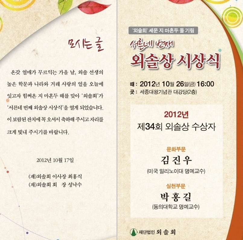 ‘제34회 외솔상’ 시상식이오는 26일 세종대왕기념관 대강당에서 열립니다.이번 외솔상 수상자는문화부문은 김진우님, 실천부문은 박홍길님이 수상하십니다.이 보람된 잔치에 꼭 오셔서 축하해 주시고,자리를 크게 빛내 주시기를 바랍니다.