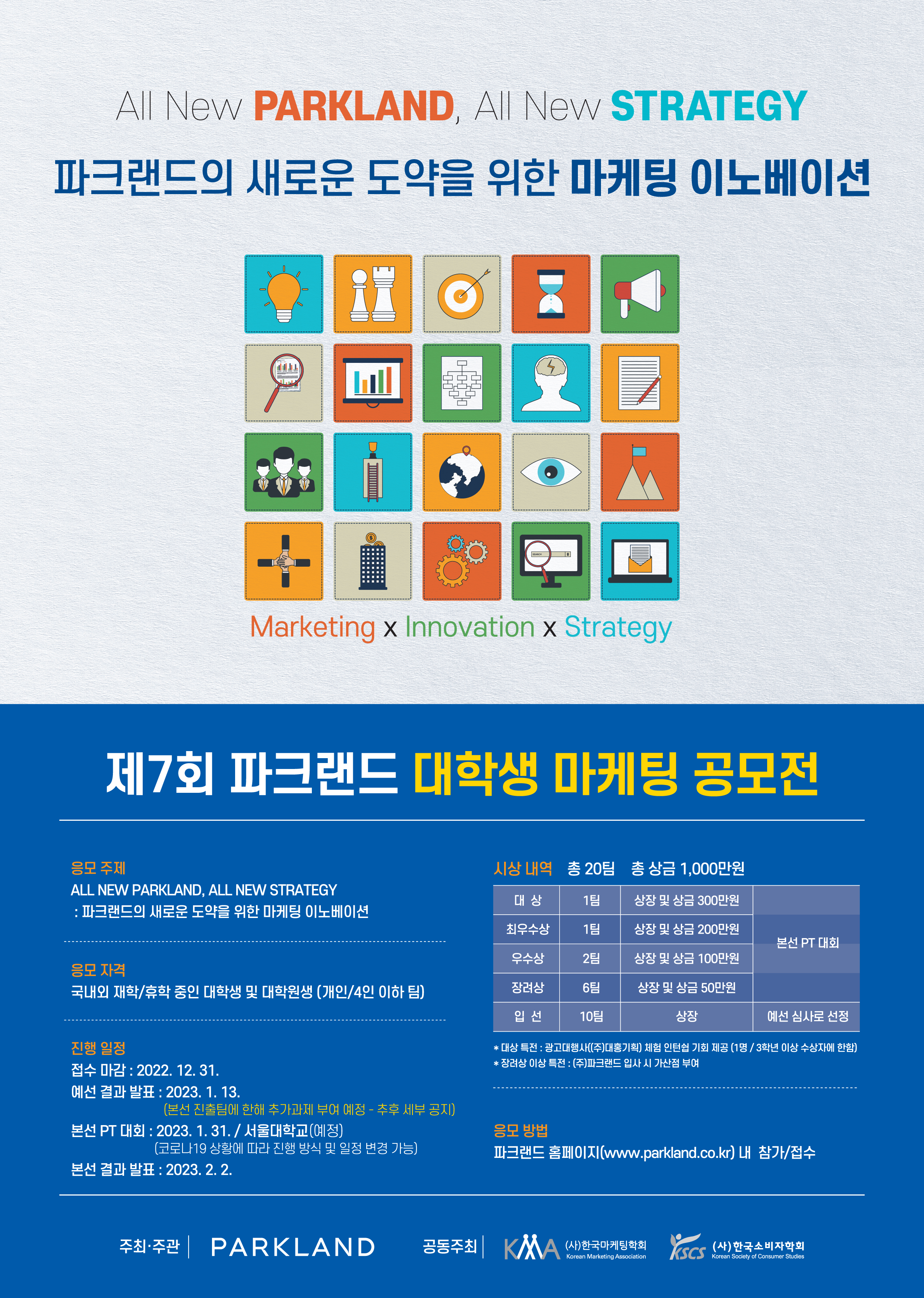(사)한국마케팅학회와 (주)파크랜드의 공동주최로 전국 대학(원)생을 대상으로 '제7회 파크랜드 대학생 마케팅 공모전'을 개최합니다.