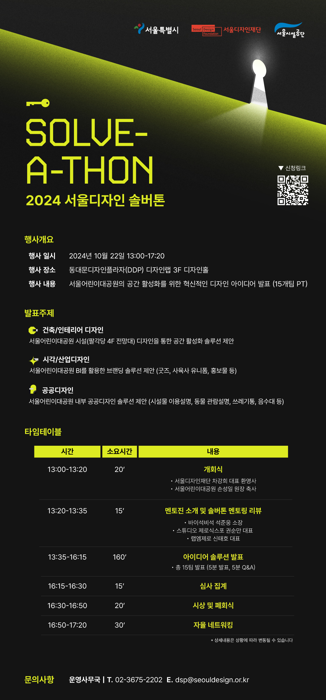 서울디자인재단은 10.22(화) 동대문디자인플라자에서 <제 1회 2024 서울디자인 솔버톤>을 개최합니다.심사를 거쳐 선발된 15개 팀 중 서울어린이대공원을 새롭게 변화시킬 최고의 디자인솔루션 아이디어를 선발하는 자리에 함께 해 주시길 바랍니다.※ 모든 청중에게는 국내최대 디자인 축제이자 MICE 행사인 서울디자인 2024 전시 티켓(12,000원 상당)이 제공되어 행사 직후 관람하실 수 있으며,