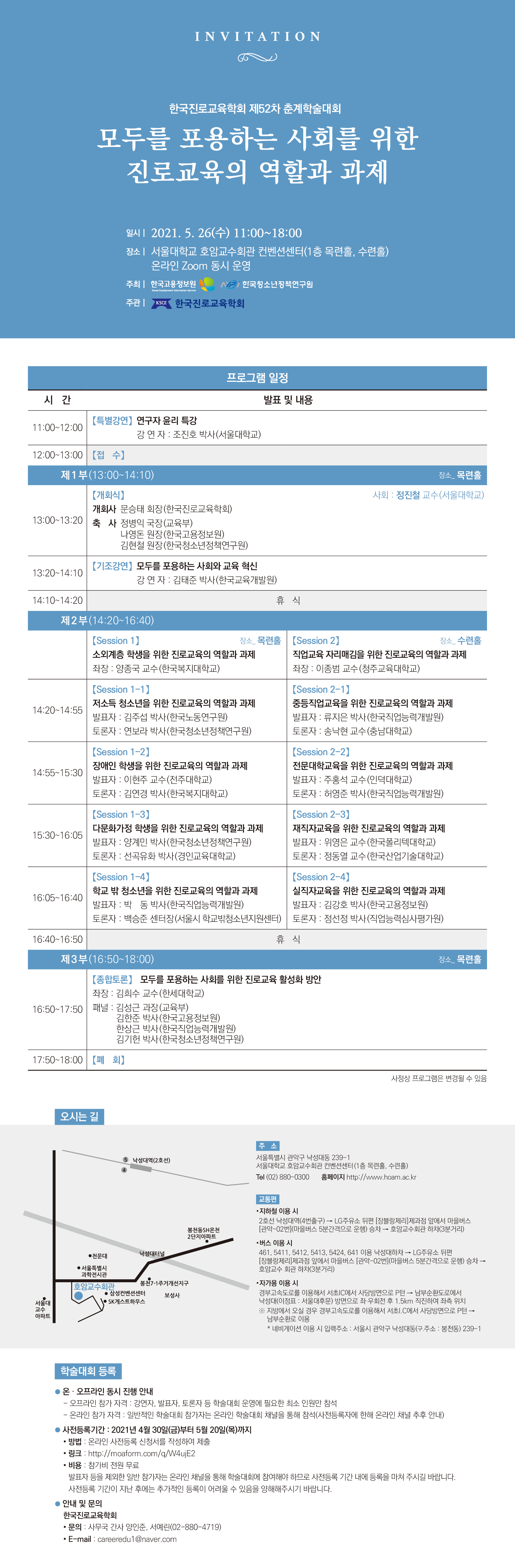 - 학술대회 세부 프로그램은 본 페이지의 첨부파일로 제시해 두었으니 다운받아 확인해주시기 바랍니다(첨부파일명: [붙임1] 한국진로교육학회 제52차 춘계학술대회 세부 프로그램).