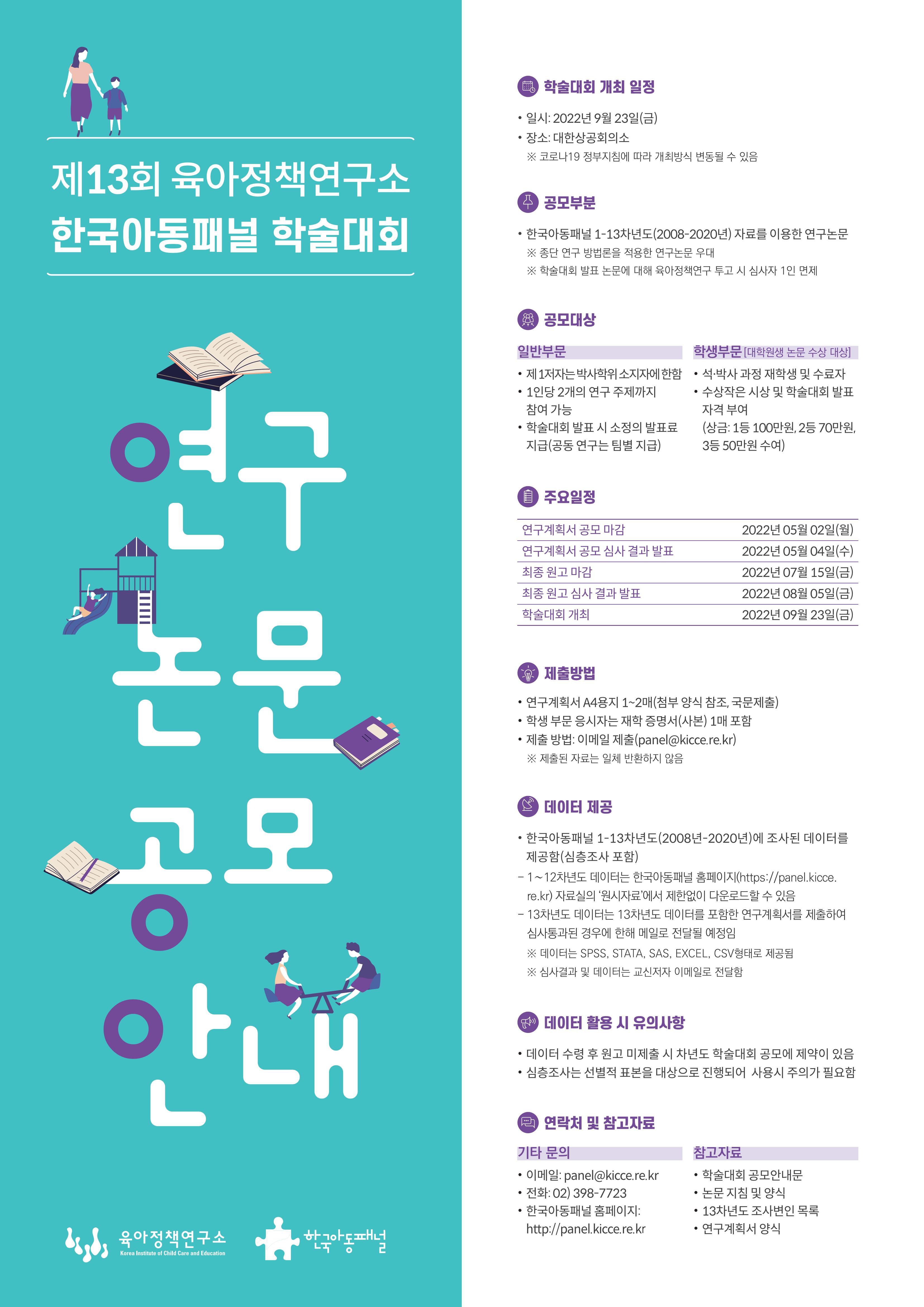 본 연구소에서는 한국아동패널 1~13차 자료를 바탕으로 「제13회 한국아동패널 학술대회」 연구계획서를 공모합니다.