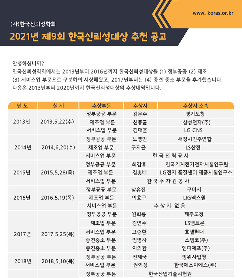 2021 제9회 한국신뢰성대상 추천 공고