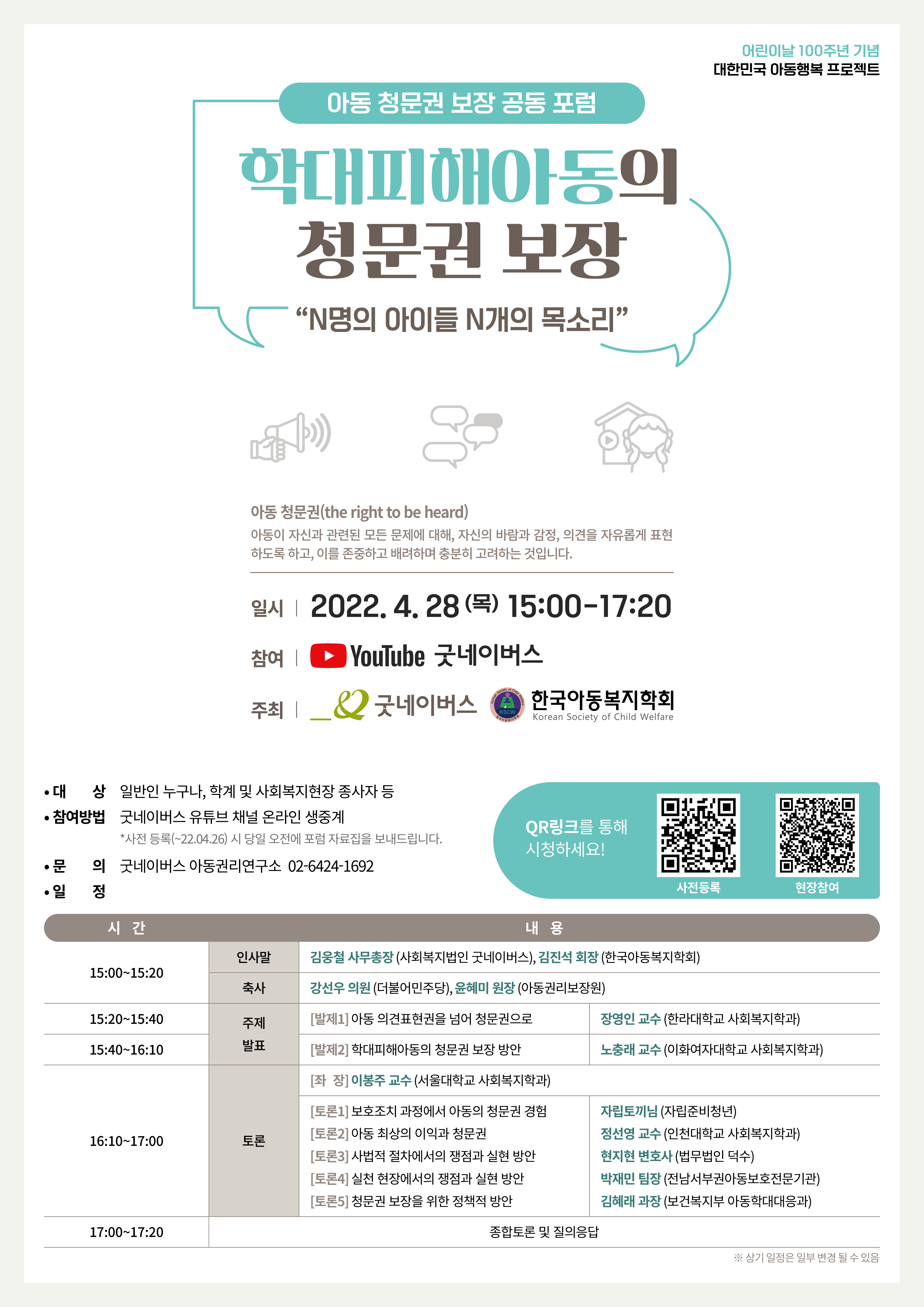 주 제 : 학대피해아동의 청문권 보장 “N명의 아이들 N개의 목소리” 일 시 : 2022년 4월 28일(목요일) 15:00~17:20 진 행 : 굿네이버스 유튜브 실시간 중계 |