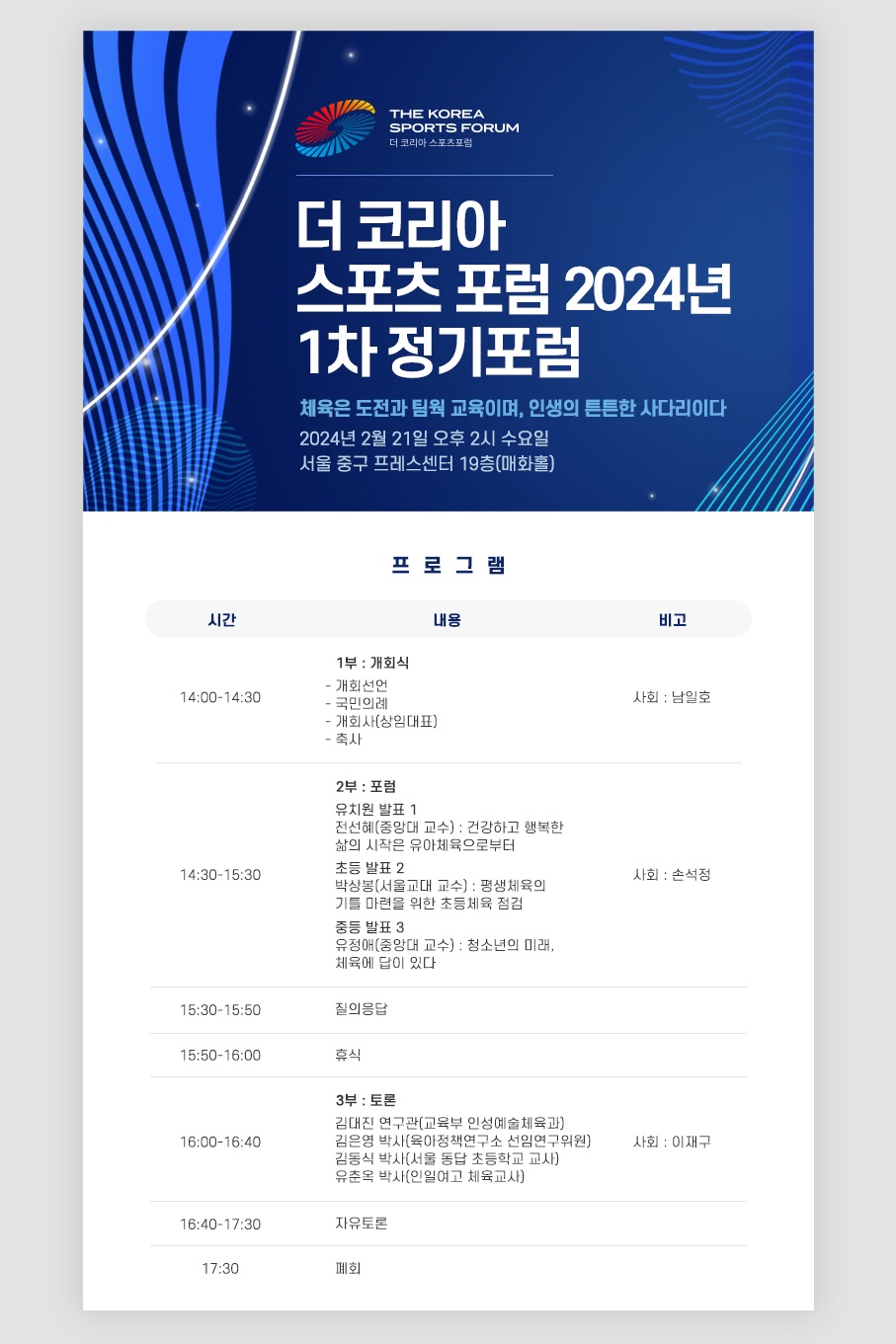 서울 중구 프레스센터 19층(매화홀)에서 더 코리아 스포츠 포럼 2024년 1차 정기포럼이 개최됩니다.