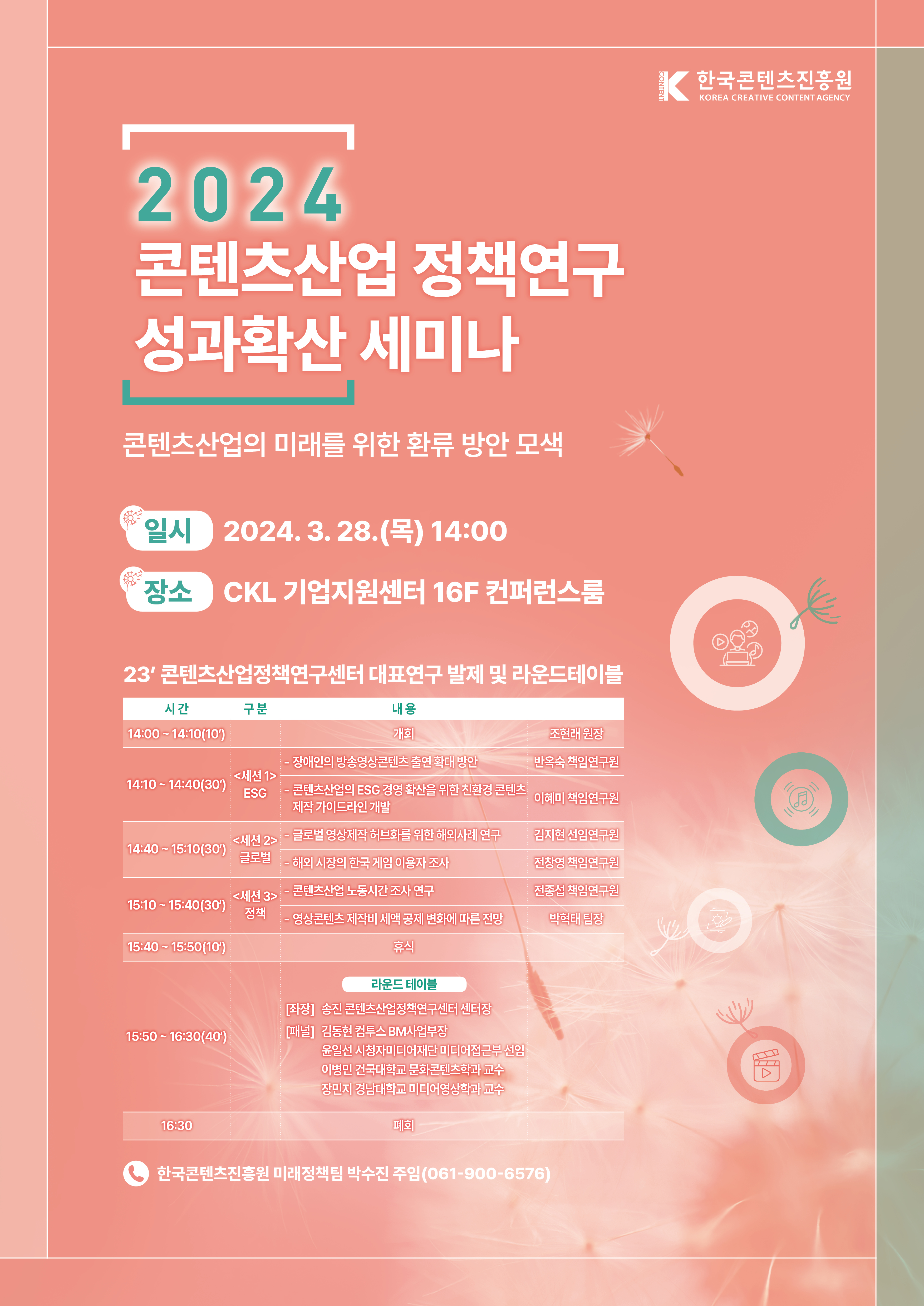 - 행 사 명: 2024 콘텐츠산업 정책연구 성과확산 세미나 <콘텐츠산업의 미래를 위한 환류 방안 모색>