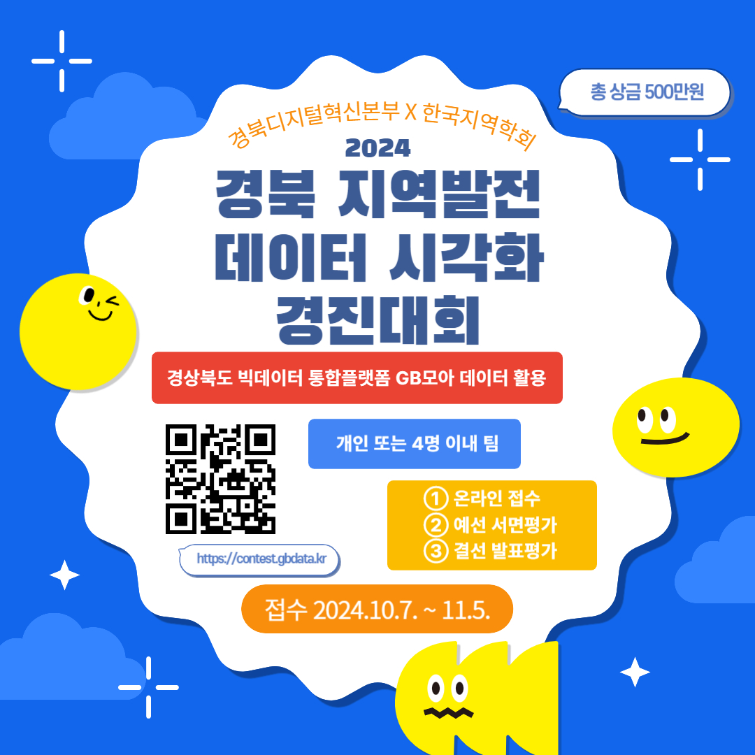 한국지역학회에서 경북디지털혁신본부와 함께 경북 지역발전 데이터 시각화 경진대회를 개최하오니 학회원의 많은 관심과 참여 바랍니다.
