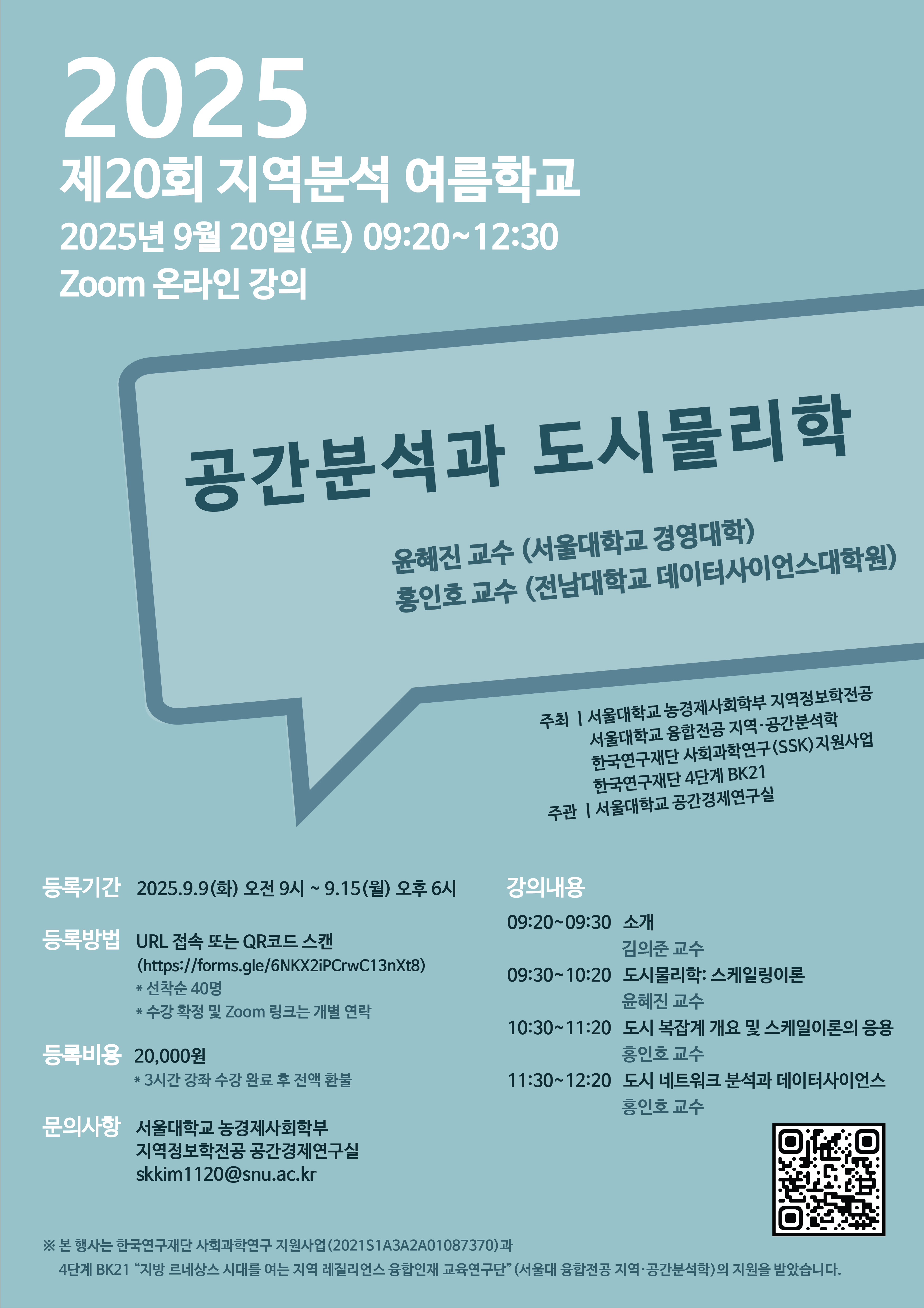 서울대학교 농경제사회학부 지역정보학 전공 공간경제연구실에서 제20회 지역분석 여름학교를 개최합니다.