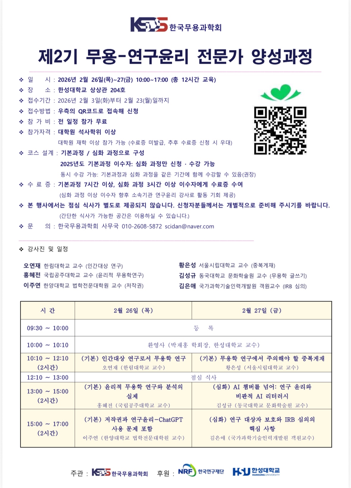 2026 한국무용과학회 제2기 무용-연구윤리 전문가 양성과정