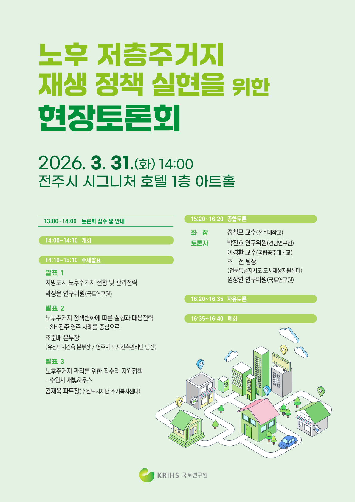 국토연구원에서 노후 저층주거지 재생 정책 실현을 위한 현장토론회가 다음과 같이 개최될 예정입니다.