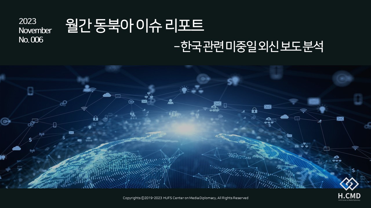 2. 한국외대 미디어외교센터(H.CMD)에서 <동북아 이슈 리포트> 6호(11월호)를 다음과 같이 발간하였습니다. 회원님들의 많은 관심과 참여 바랍니다.