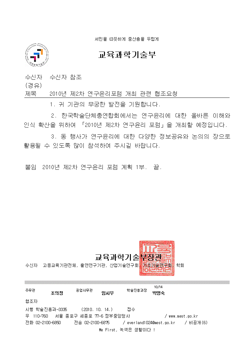 한국학술단체총연합회에서 교육과학기술부와 한국연구재단의 지원을 받아 연구윤리의 올바른 이해와 인식확산을 위하여 제 2차 연구윤리포럼을 개최하고자 합니다. 많이 바쁘시겠지만, 함께 참여하시어 의미있는 논의의 장이 될 수 있도록 해 주시면 감사하겠습니다.