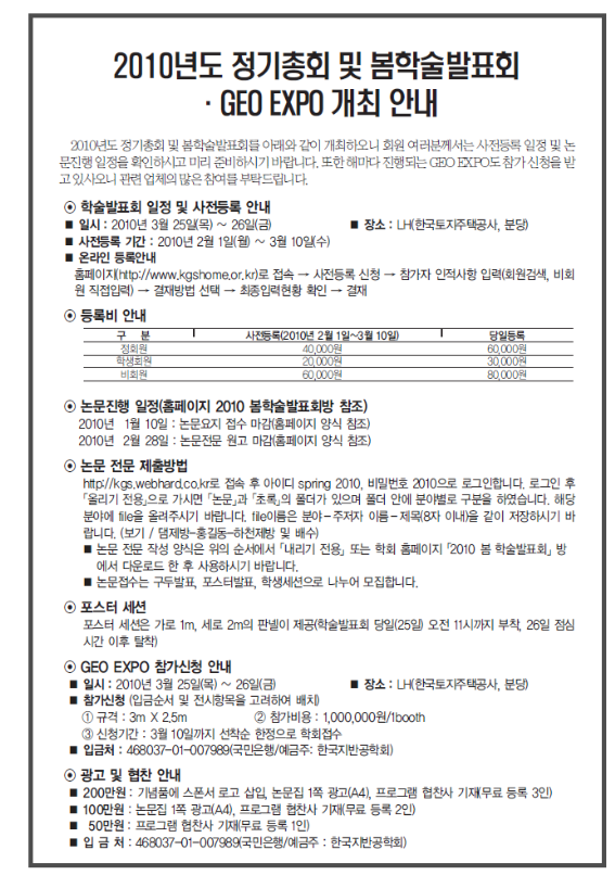 한국지반공학회 2010년도 정기총회 및 봄 학술발표회 개최 안내