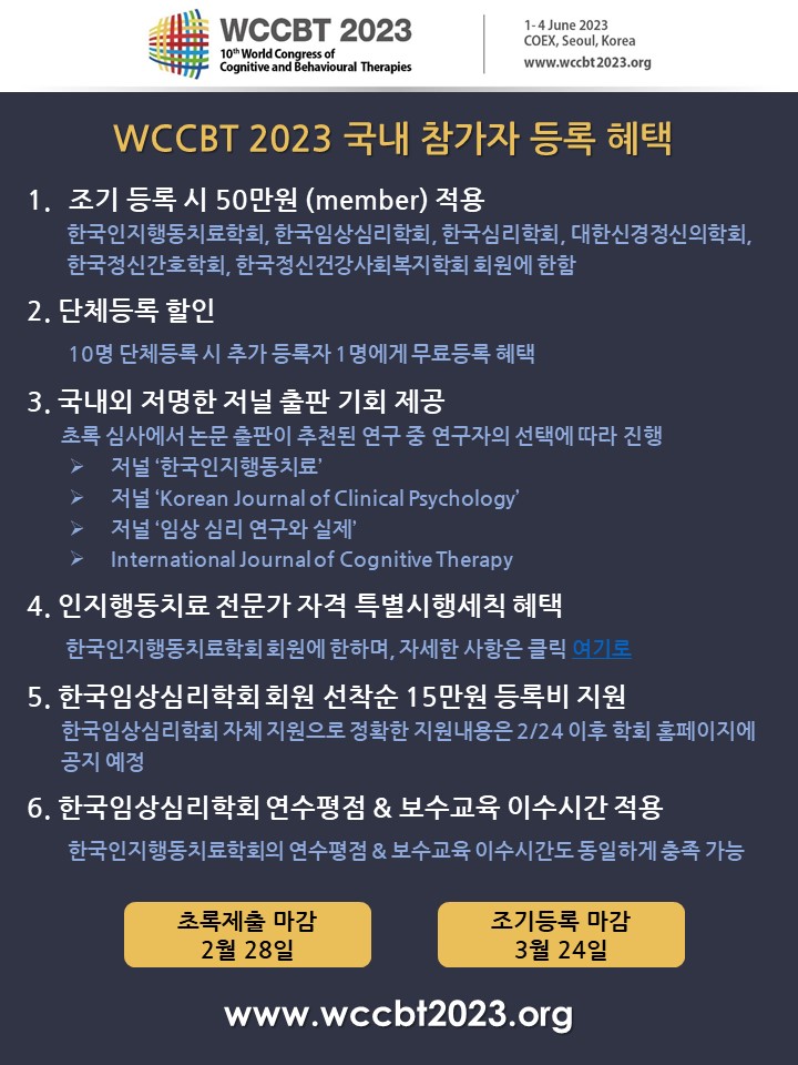 제10차 세계인지행동치료학술대회(WCCBT 2023)가 2023년 6월 1일(목)부터 4일(일)까지 4일간 코엑스 컨벤션센터에서 개최됩니다.