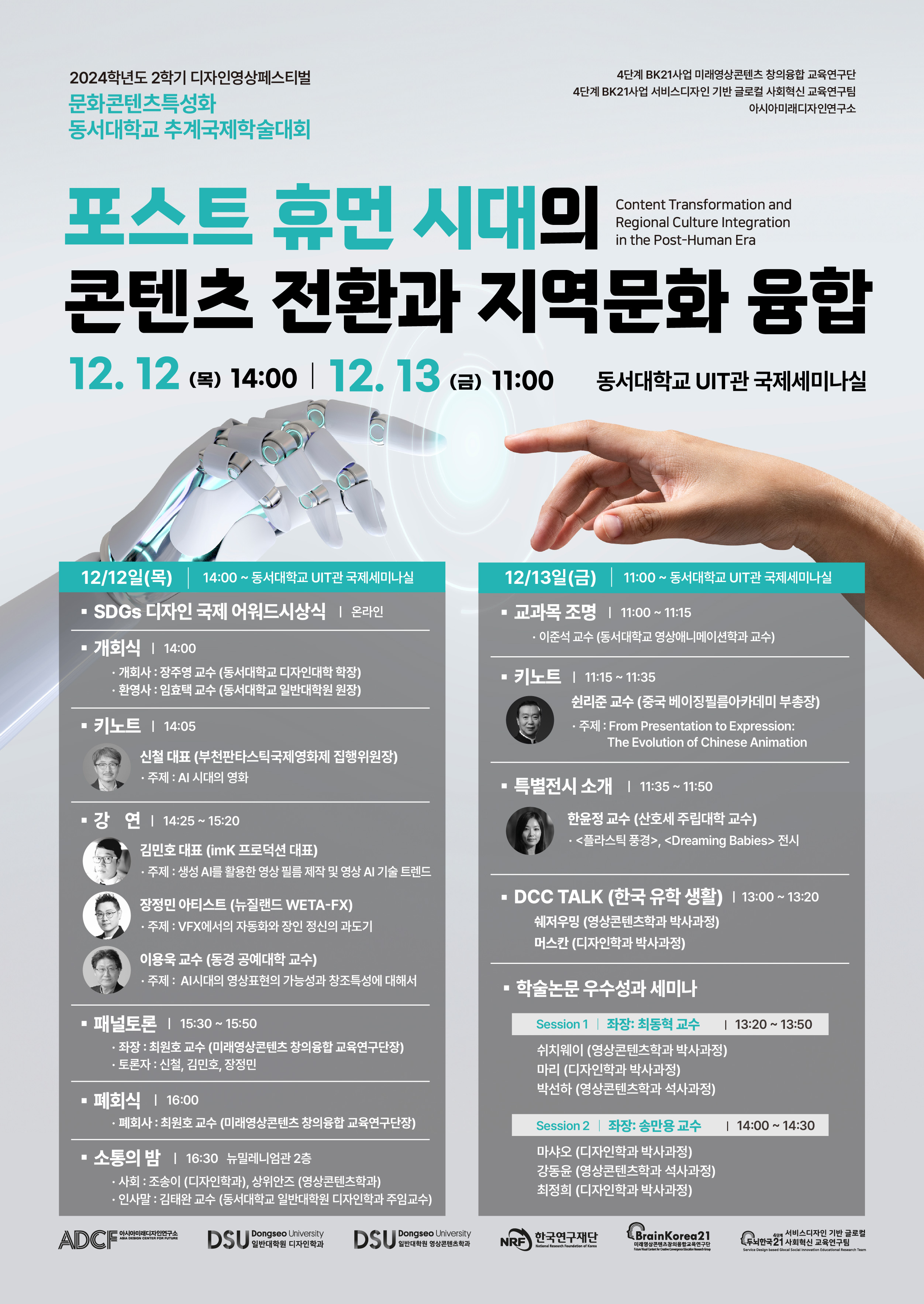 디지털 테크놀로지를 넘어 인공지능이 생성하는 콘텐츠를 마주하게 된 포스트휴먼의 시대는 디자인과 콘텐츠에 대한 새로운 시각과 자세가 요구되고 있습니다. 창작 환경과 개념의 변화는 메시지의 수용과 전파에 영향을 끼치게 되고, 이는 곧 인간의 존재와 사회에 대한 새로운 인식을 요구할 것이기 때문입니다. 특히 세계적 콘텐츠의 자산으로서 가치를 가지는 지역문화는 패러다임의 변화 속에서 의미심장한 문화원형의 자원으로 부상하고 있습니다. 이와 같은 변화와 초연결의 시대에 동서대학교의 디자인, 콘텐츠 연구자들은 향후 마주할 콘텐츠 전환과 함께 우리가 가진 지역문화의 가치창조를 위한 학술적 교류의 장을 개최하고자 합니다.