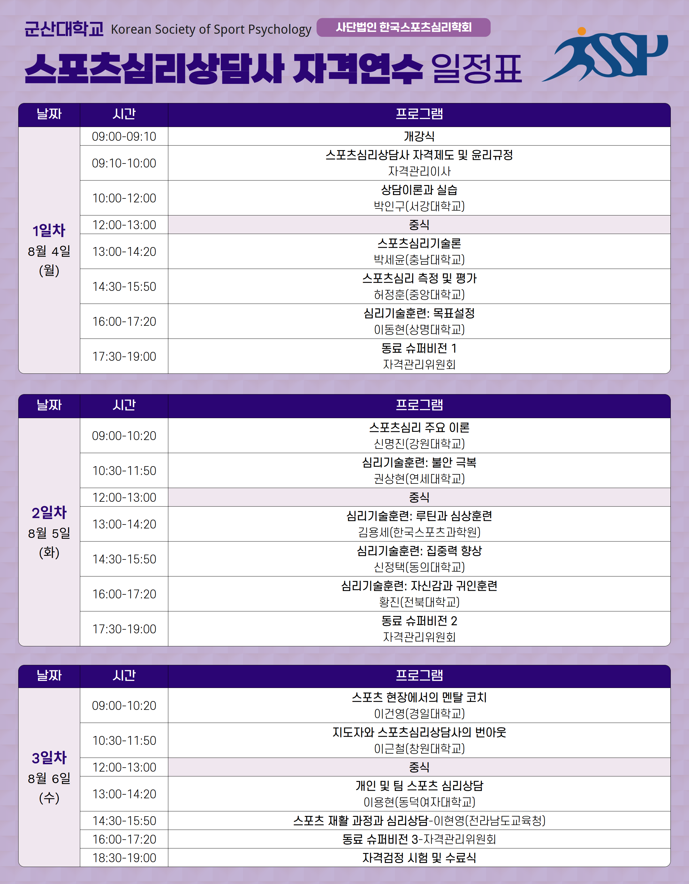 * 접수비 및 자격연수비 계좌: KEB하나은행 748-910014-29104 (예금주: 사단법인 한국스포츠심리학회)