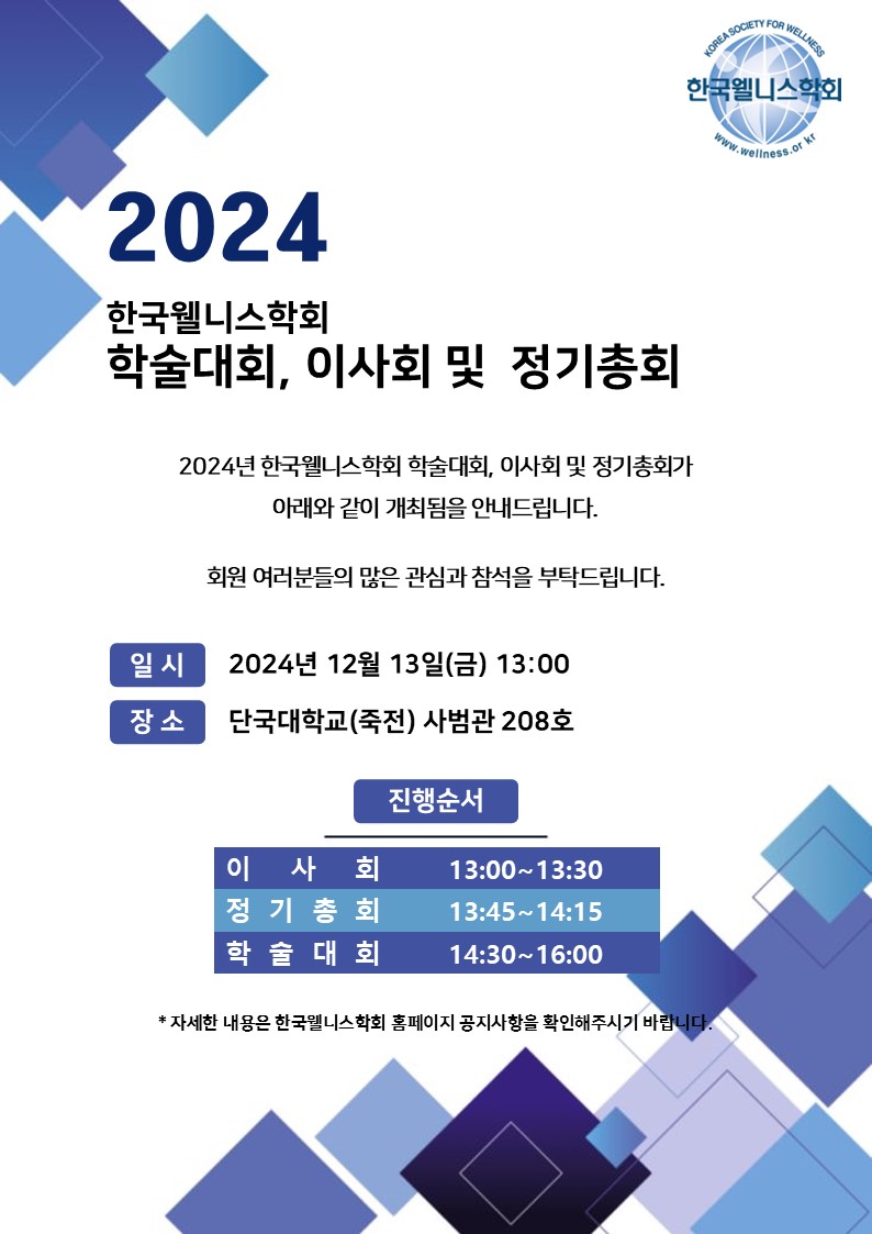 2024 한국웰니스학회 이사회·정기총회 및 학술대회 행사와 관련하여 아래와 같이 안내드립니다.