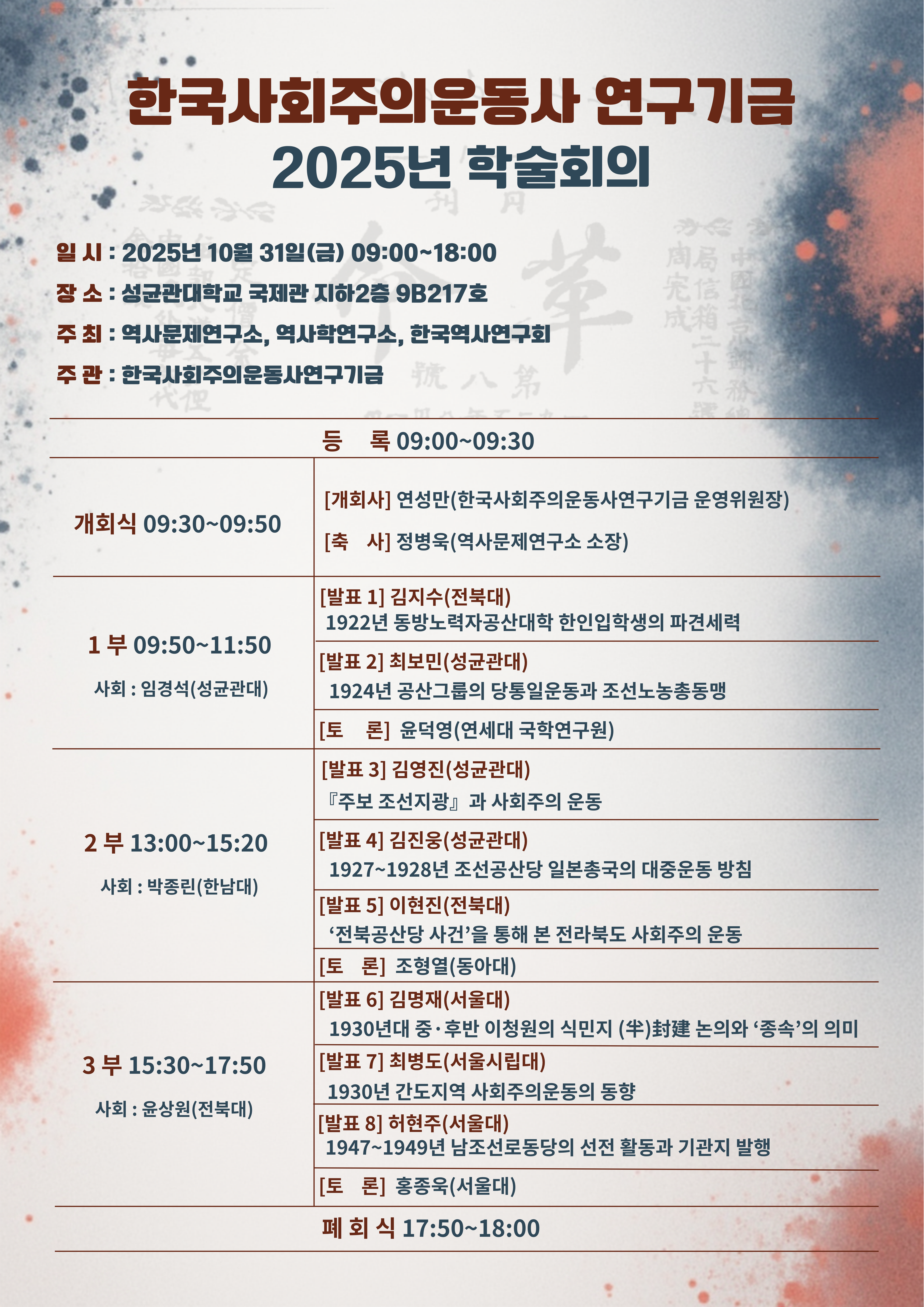 저희 연구소가 공동주최하는 한국사회주의운동사 연구기금 2025년 학술회의가 10월 31일(금) 성균관대학교에서 열립니다.