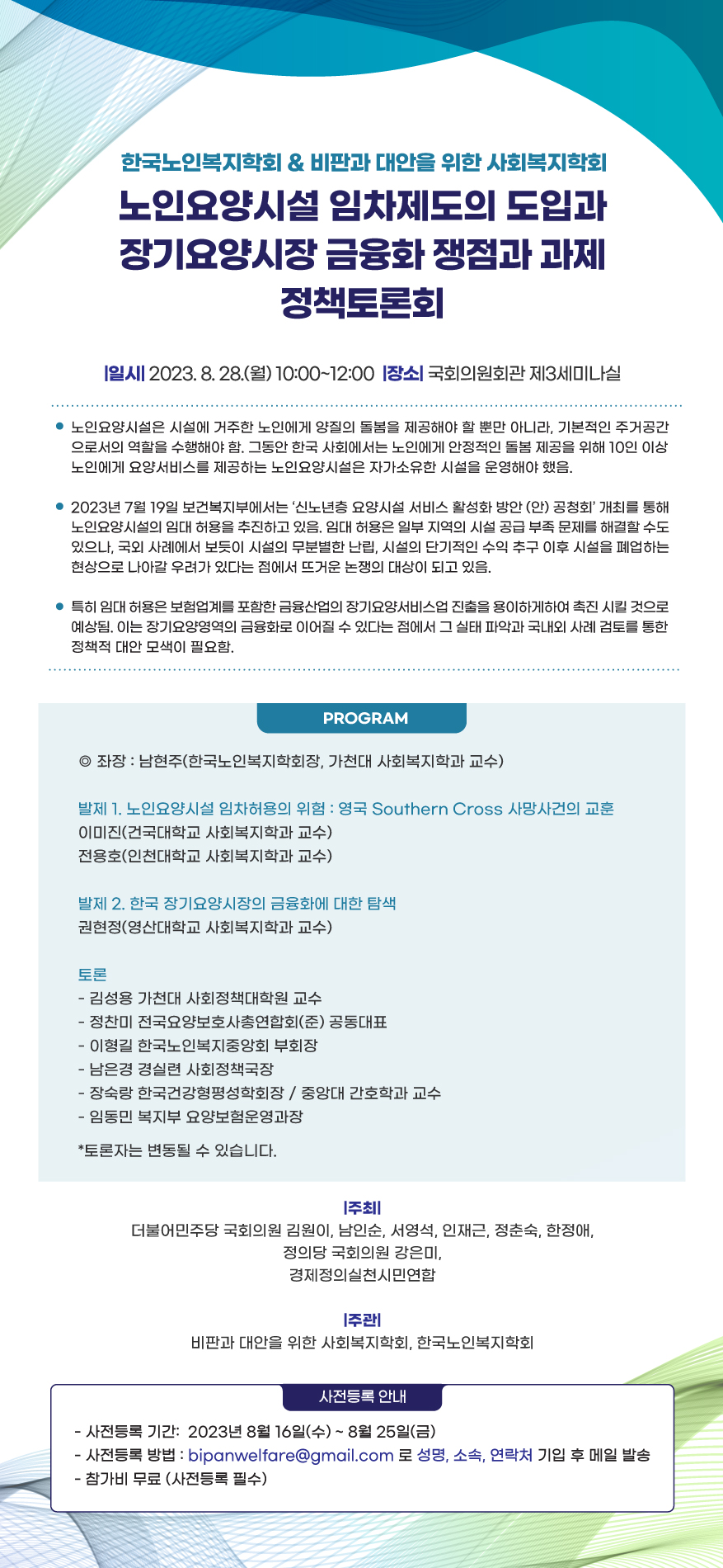 2008년 노인장기요양보험이 도입되고 학계는 ‘장기요양제도의 공공성 보장’을 계속 요구해왔습니다. 그러나 보건복지부가 2023년 7월 19일 “신노년층을 위한 요양시설 서비스 활성화 방안” 공청회에서 노인요양시설의 임차허용을 추진하고 있는 것으로 확인되었습니다.