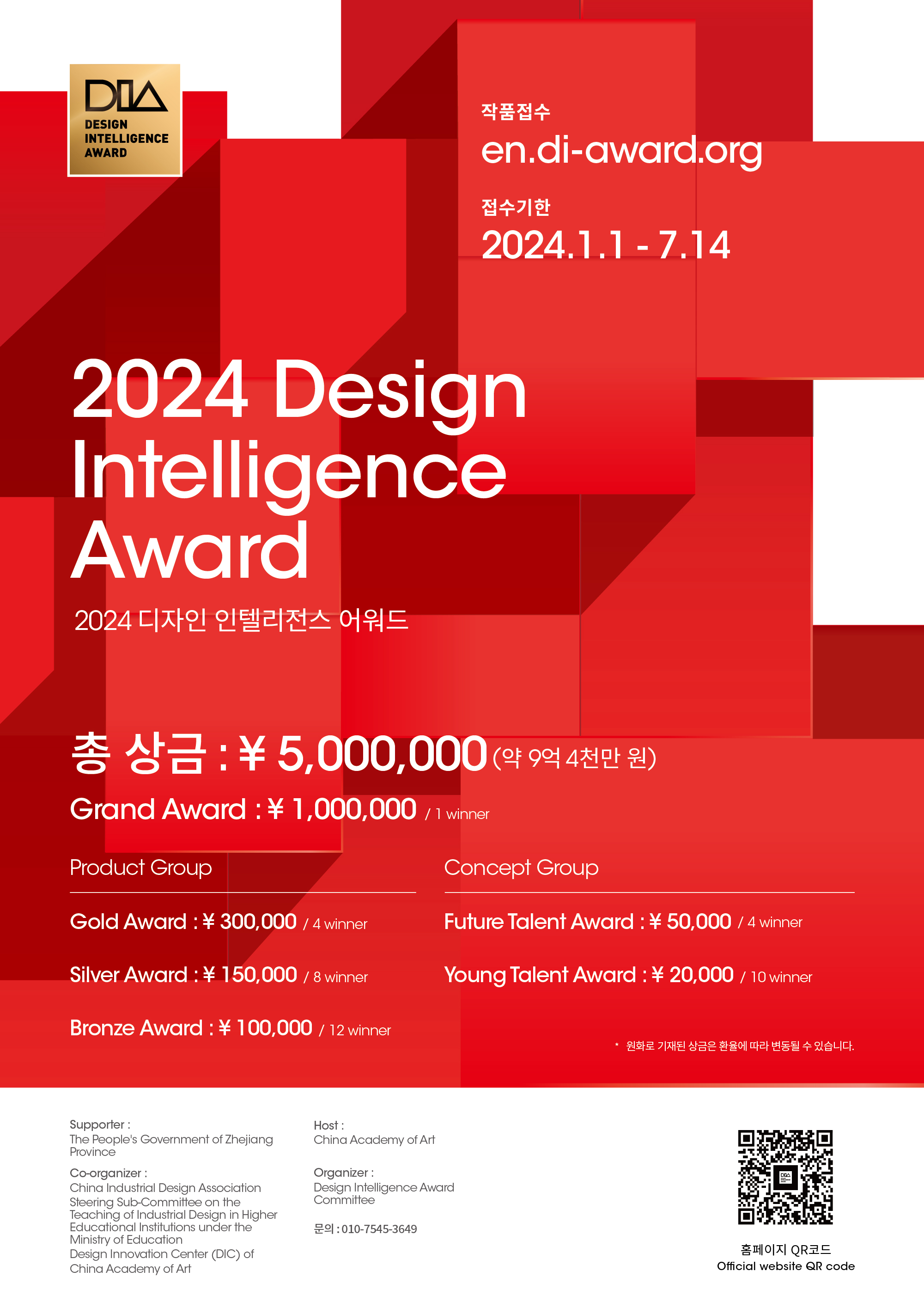 DIA(디자인 인텔리전스 어워드)는 중국 최초의 예술대학으로서 명망이 높은 'China Academy of Art'가 지난 2015년에 제정한 국제 디자인 공모전으로 60여개 국가 참가 총 상금 ¥5,000,000(약 9억 4천만원)에 달하는 규모의 디자인 공모전입니다.