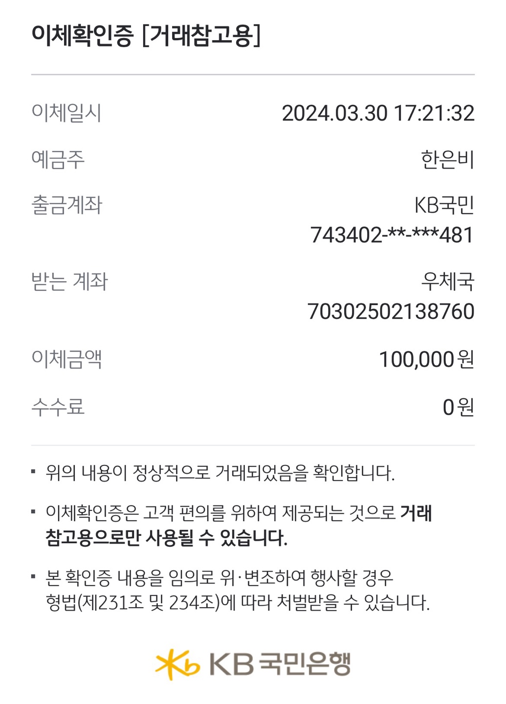 '우체국70302502138760 윤재희' 로 계좌가 안내되어있는 것을 보고 해당 계좌로 10만원을 입급하였습니다.