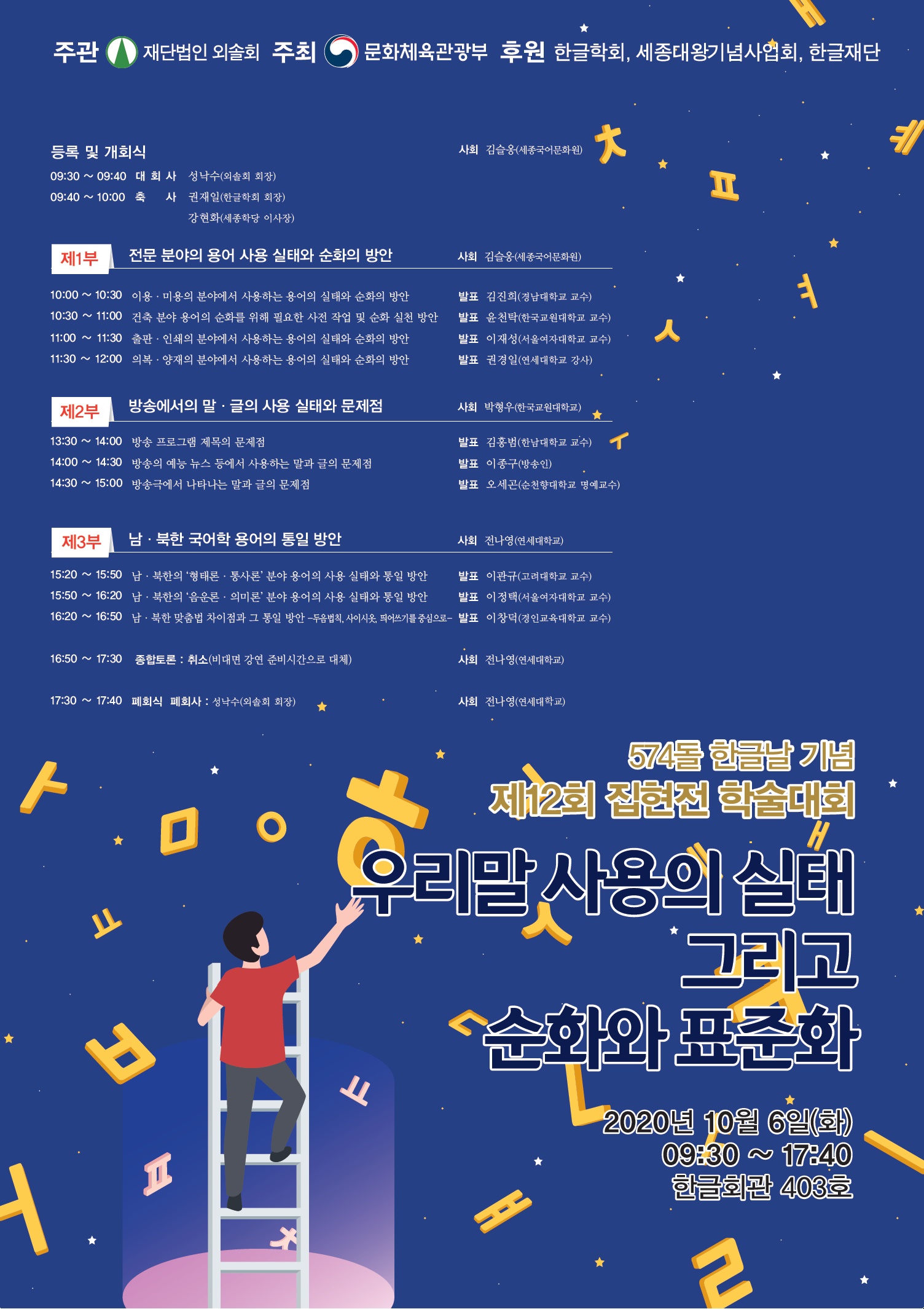 우리 외솔회는 올해에도 ‘문화체육관광부’로부터 지원을 받아, 한글 반포 574돌을 기념하여, ‘제12회 집현전 학술대회’(10/6.화)를 개최합니다.