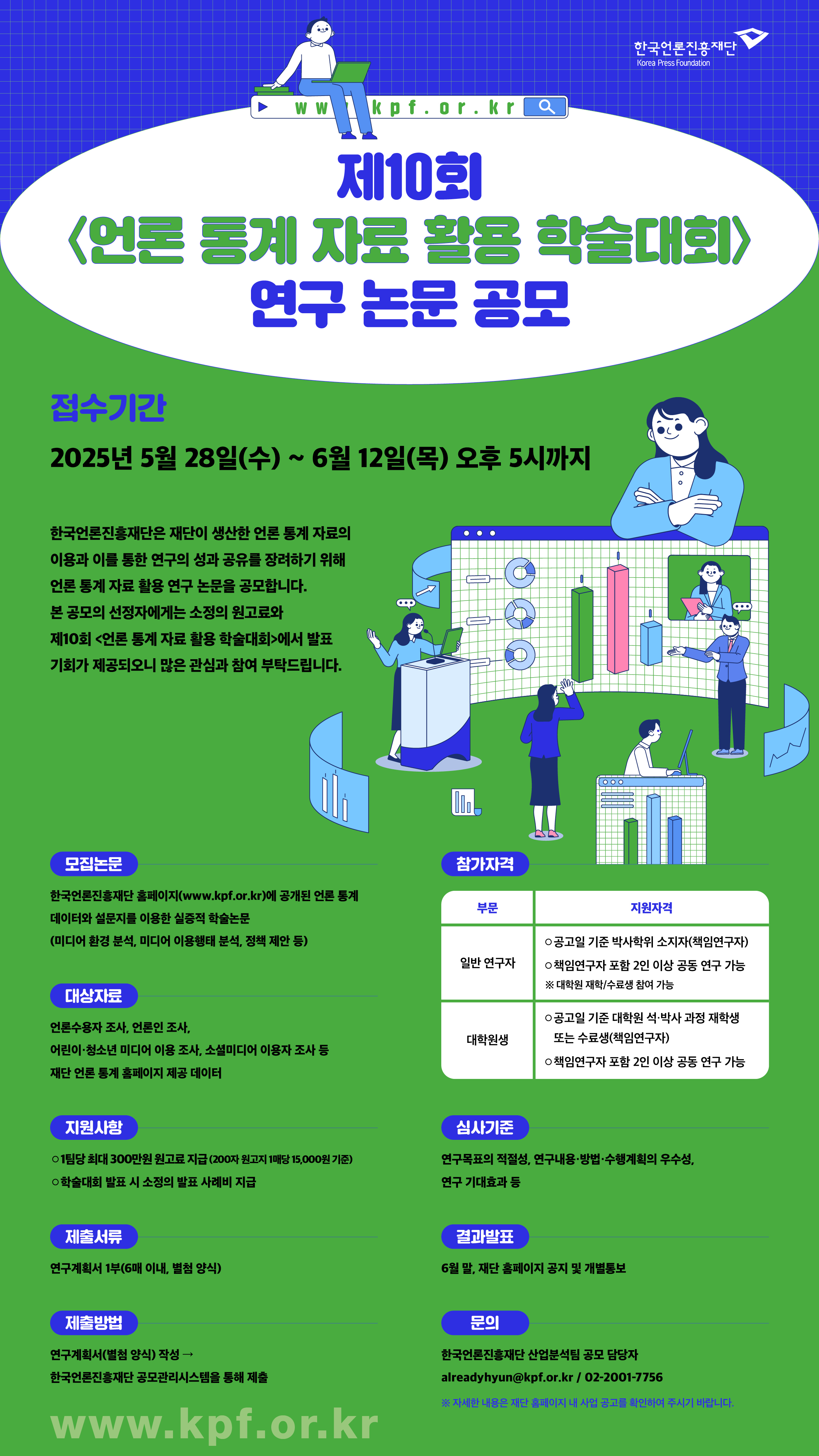 본 공모의 선정자에게는 소정의 원고료와 제10회 <언론 통계 자료 활용 학술대회>에서 발표 기회가 제공되오니 관심 있는 대학원생 및 연구자 여러분의 많은 참여 부탁드립니다.